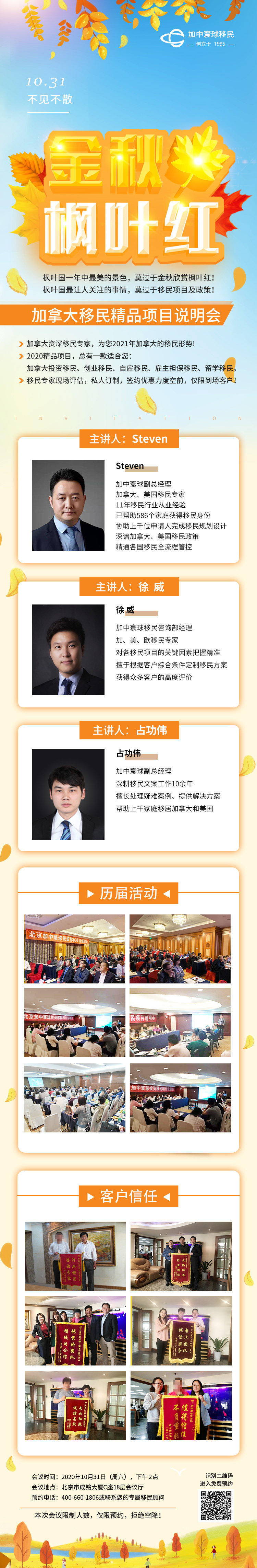 2020年10月31日,加中寰球再次舉辦加拿大精品移民項目說明會。屆時,加中寰球副總經理郝順心先生將攜咨詢部、項目部、文案部資深移民專家組成的最強陣容,對加拿大自雇移民、投資移民、創業移民、雇主擔保、留學移民、團聚移民等項目進行最權威解讀,對全球移民形勢作精準分析,給您的正確決策提供最科學的依據!簽約還有神秘大禮相送!相信一定讓您不虛此行!