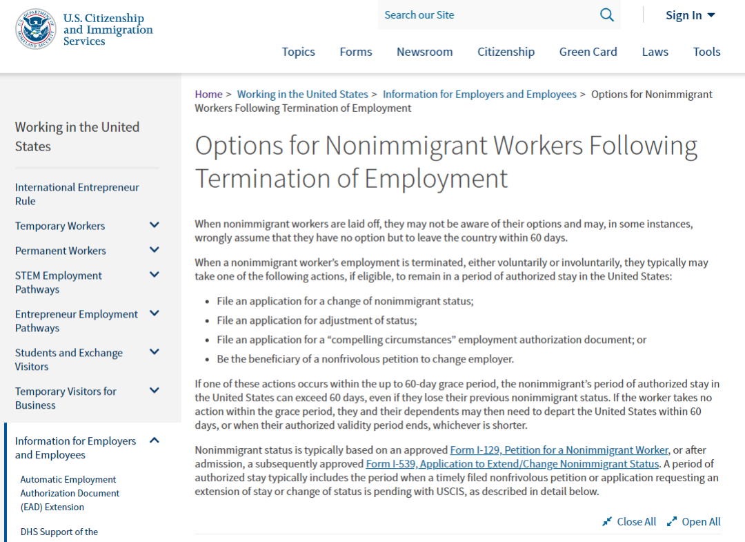 或者,如果改變身份的請求被拒絕,或者新的就業申請要求領事或入境口岸通知,個人必須離開美國,并在開始新的工作之前以就業授權的分類被接納。當非移民員工的雇傭關系終止時,在符合條件的情況下,他們通常可以采取行動延長在美國的合法逗留時間。這些行動包括申請改變非移民身份;提出身份調整申請;提出“令人信服情況”就業授權文件申請等。若員工在寬限期內沒有采取行動,他們及其家屬可能需要在60天內或其授權有效期結束時離開美國,以較短者為準。